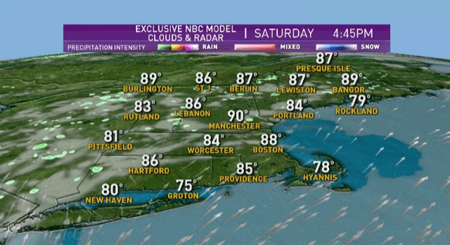 We're watching the thermostats in locations across New England Saturday, including Lowell, Burlington, Concord, New Hampshire, and Presque Isle, Maine. If you reach 90 degrees there, you will be in a heat wave, meaning three or more consecutive days with temperatures reaching that 90 degree mark.